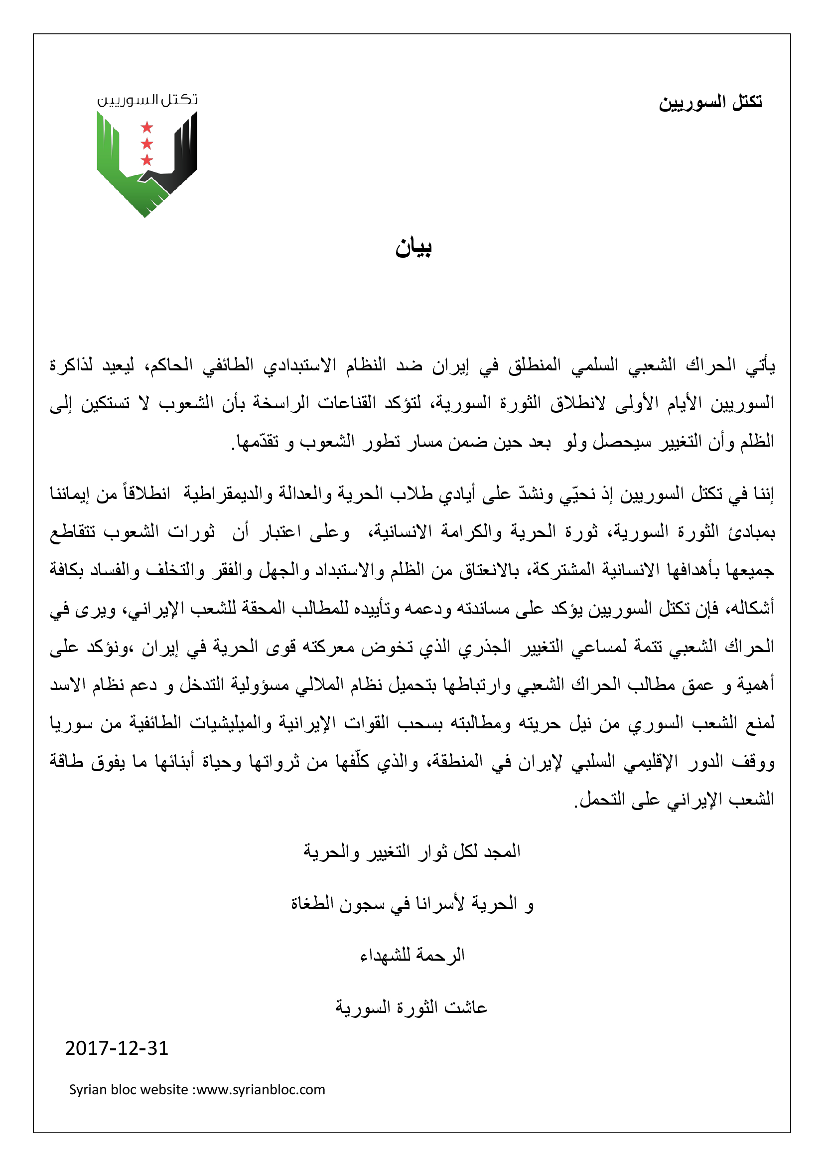 إننا في تكتل السوريين إذ نحيّي ونشدّ على أيادي طلاب الحرية والعدالة والديمقراطية انطلاقاً من إيماننا بمبادئ الثورة السورية، ثورة الحرية والكرامة الانسانية، وعلى اعتبار أن ثورات الشعوب تتقاطع جميعها بأهدافها الانسانية المشتركة، بالانعتاق من الظلم والاستبداد والجهل والفقر والتخلف والفساد بكافة أشكاله، فإن تكتل السوريين يؤكد على مساندته ودعمه وتأييده للمطالب المحقة للشعب الإيراني، ويرى في الحراك الشعبي تتمة لمساعي التغيير الجذري الذي تخوض معركته قوى الحرية في إيران ،ونؤكد على أهمية و عمق مطالب الحراك الشعبي وارتباطها بتحميل نظام الملالي مسؤولية التدخل و دعم نظام الاسد لمنع الشعب السوري من نيل حريته ومطالبته بسحب القوات الإيرانية والميليشيات الطائفية من سوريا ووقف الدور الإقليمي السلبي لإيران في المنطقة، والذي كلّفها من ثرواتها وحياة أبنائها ما يفوق طاقة الشعب الإيراني على التحمل.